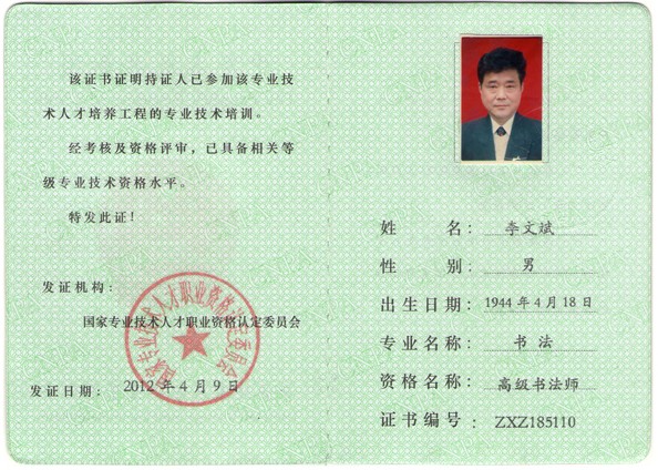 高级书法师证书