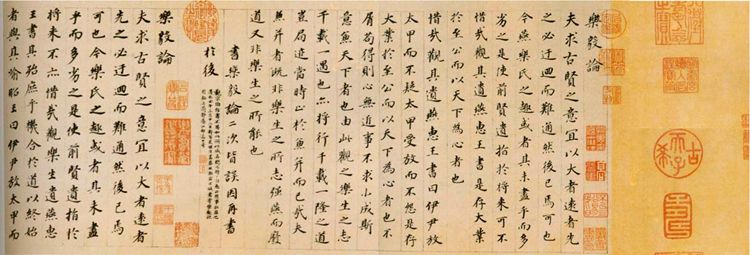 董其昌没有留下一部书论专著,但他在实践和研究中得出的心得和主张,散见于其大量的题跋中, 董其昌有句名言:“晋人书取韵,唐人书取法,宋人书取意。”这是历史上书法理论家第一次用韵、法、意三个概念划定晋、唐、宋 三代书法的审美取向。这些看法对人们理解和学习古典书法,起了很好的阐释和引导作用。董其昌一生勤于书画,又享高寿,所以传世作品很多,代表作有《白居易琵琶行》《三世诰命》《草书诗册》《烟江叠嶂图跋》《倪宽赞》《前后赤壁赋册》等。
