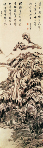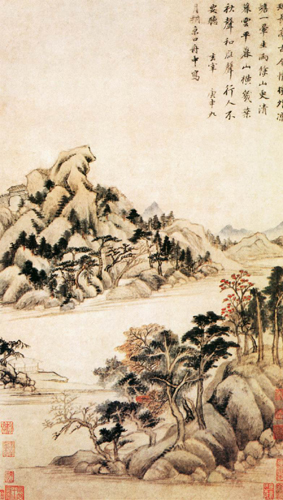 再如他暮年所作《关山雪霁图》,山峦林壑,绵延无际。右方重峦叠嶂,气势沉雄。中间幽壑重重,峭壁矗立,村落、丛林、流泉、山径,错落有致,杂而不乱;大江曲折跌宕其间,虽有干岩万壑,亦无窒碍不通的感觉。左方云烟弥漫,浸淫树石,路遥山重,隐人微茫,深远莫测,意味不尽。图中以渴笔钩勒峰峦山石,皴擦的运用极其准确、灵活,而线条流走轻快,疏密得宜。山冈陵石的凹凸明暗,则以横点巨苔,配上淡墨直皴的层层渲染来加以完成,技巧纯熟,无懈可击。意境朴厚深邃,很有“千山鸟飞绝,万径人踪灭”的诗意。全图用笔老辣生拙,骨力练达,墨气鲜润,绝去甜俗,以疏旷之笔,画出凝寒淡远的景致。卷尾数行行楷跋文,书体娟秀刚劲,更使此图富有书卷气,爽朗潇洒,自具风格。