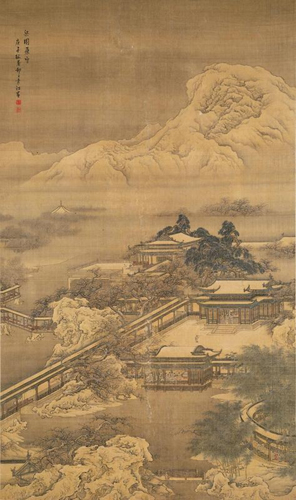 袁江,清代著名画家,字文涛,江苏江都(今扬州)人。善界画,长于山水楼阁,精湛绚丽,能粗能细。初学仇十洲,中年继而临摹古人画,在传统基础上创出自己的新路。生活在康熙年间。他后半生受当时在扬州的山西盐商之聘,同他的从子袁耀到山西运河作画,作品流传在北方较多。其山水主要学宋代阎次平;画石多鬼面皴;楼阁主要学郭忠恕,工整严密。后期多画古代宫苑图,如《梁园飞雪图》、该图以枚乘、江淹的梁园、兔园赋为依据,极尽宫苑之壮丽 。另画《东园胜概图》卷,此图用长卷形式,界画精亚,建筑物比例适当,树石形态若真,山影波光,层次深远。《东园胜概图》为其代表作。还有《汉宫秋月图》等。