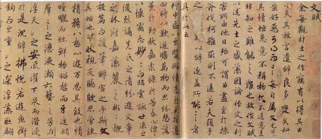 陆柬之,585年生,638年逝世,唐吴(今江苏苏州)人。虞世南外甥。官至朝散大夫、太子司议郎、崇文侍书学士。最初书学虞世南,又学欧阳询,晚临摹王羲之、王献之父子。草书笔意尤为古雅,终于成为名重一时的大书法家,与欧、褚齐名。工正行书。善临摹,虽“工于效仿,劣于独断”,但有较高成就。当时亦有人把他与欧、虞、褚并称初唐四大家(但一般说初唐四大家为欧、虞、褚、薛)。隶、行书为妙品,草书为能品。他的书法作品流传甚少,隶行殆已绝迹。依据现在流传下来的《兰亭诗》、《文赋》来看,他的书学师承传递关系,确实与王书是一脉相承的。故观草书笔意古雅,其书名重于世,当不虚传。李嗣真《书后品》指出“陆学士(柬之)受于虞秘监(世南),虞秘监受于永禅师(智永),皆有体法。”又曰:“陆柬之学虞草体,用笔青出于蓝”。《文赋》,墨迹本,无款。晋陆机撰,传陆柬之书。纸本,行书。据《石渠宝笈》载,纵26.6厘米,横370厘米,全卷共144行,计1658字,其中行楷1566字,草书92字。真迹现藏台北故宫博物院。陆柬之书写的《文赋》,是西晋陆机的名著。陆机为陆束之远祖。陆柬之怀着非常崇敬的心情来书写先人的名作,以柬之之逸翰,绍先祖之宏文,所以因称为“二绝”。此帖书法风骨内含,神采外映,字字珠玉,笔笔圆劲。通观全帖,结体稍呈内敛,章法严谨,笔法妍润淳雅,很显然已开赵孟頫行楷书之先河。书家们把此卷视为瑰宝,历来书家们都给予很高的评价。