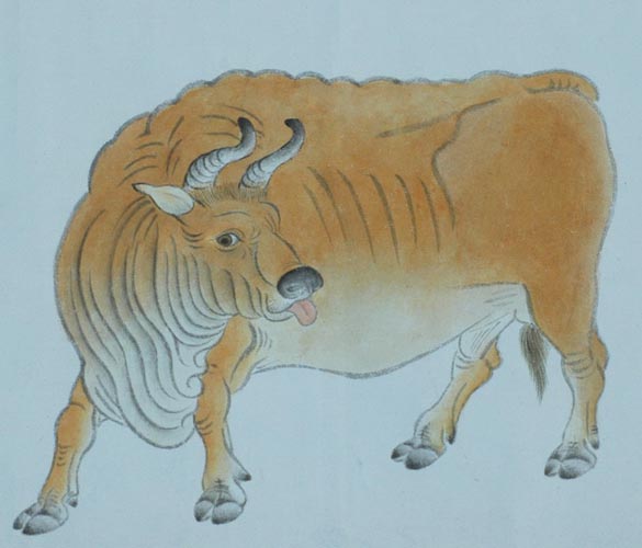 韩滉的《五牛图》问世以后,人们惊叹他所画的五头牛,不仅形似,而且形态各异,各具特征,肥瘦有别,牛色互异,笔法简朴,曲尽其妙,真是神妙之笔。这画虽为长卷形式,但所画牛却各有独立,除了一丛荆棘之外,别无景物。这幅画在用色上很有特点的。现实的黄牛,品种虽多,但色相变化不多,图中三头黄色,两头深褐色基本是最典型的毛色, 全画虽然只用两种颜色,给人的感觉却是丰富多彩的。这幅画还有个很大的特点能从牛身上看到一种感情,从它们不同的姿势,各自的眼神,我们似乎可以感受到它的憨诚、健壮、朴厚、执拗、勤奋的性格。