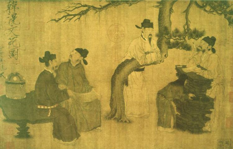 《文苑图》是我国古代工笔人物画中的传世精品之一。现藏北京故宫博物院,绢本设色,纵37厘米,横58.5厘米。相传所画是韩滉同时代的诗人钱起、刘长卿等在琉璃堂宴集的情景。图中主要描绘四个戴幞头、穿袍服的唐代文人相聚一起咏诗作文的场面。此画人物造型准确生动,逼真传神,惟妙惟肖;衣纹组织疏密有致,精练明快;用笔插以兰叶兼用铁线描,行笔微有顿挫转折使线条圆润秀挺;设色清淡高雅,格调超逸,在表现技巧上充分地体现了唐代人物画的基本特征及高超的绘画风格,堪称典范之作。