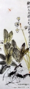 齐白石在绘画艺术上受陈师曾影响甚大,他同时吸取吴昌硕之长。他专长花鸟,笔酣墨饱,力健有锋。但画虫则一丝不苟,极为精细。他还推崇徐渭、朱耷、石涛、金农。尤工虾蟹、蝉、蝶、鱼、鸟、水墨淋漓,洋溢着自然界生气勃勃的气息。山水构图奇异不落旧蹊,极富创造精神,篆刻独出手眼,书法卓然不群,蔚为大家。齐白石的画,反对不切实际的空想,他经常注意花、鸟、虫、鱼的特点,揣摩它们的精神。他曾说:为万虫写照,为百鸟张神,要自己画出自己的面目。他的题句非常诙谐巧妙,他画的两只小鸡争夺一条小虫,题曰;“他日相呼”。一幅《棉花图》题曰:“花开天下暖,花落天下寒”。《不倒翁图》题“秋扇摇摇两面白,官袍楚楚通身黑。”