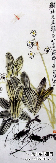 齐白石是我们所崇敬的大师,“是东方一位了不起的画家!”(毕加索语)。齐白石与吴昌硕、黄宾虹、潘天寿等不同,齐白石不是一位传统意义上的文人画家,其成功之处在於:他从文人画家统治了数百年的中国画领域,以一个农夫的质朴之情、以一颗率真的童子之心、运老辣生涩的文人之笔,开创出文人画坛领域前所未有的境界。这种境界,得到了传统文人阶层与广大平民百姓的交口称赞,从而确立了齐白石在画坛上的历史性地位。他的绘画充满了泥土芬香、生活气息,其作品既师造化又师古人,达到了民间艺术与传统艺术的统一,写生与写意的统一,工笔与意笔的统一,无限生机跃然纸上。