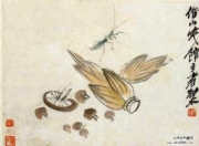 齐白石此《花卉草虫十二开册页》之工笔草虫,为白石老人六十多岁时所画:有蝴蝶、飞蛾、苍蝇、螳螂、蜻蜓、蚂蚱、蝼蛄、黄蜂、蜜蜂、蝉和纺织娘,其每只草虫的身体细节,翅膀肌肉的软硬度、质感、透明度,都表现得十分清晰而自然,腿部的表现尤见功夫,栩栩如生,形神兼备而趣味盎然。草虫画成的30年后,白石老人再补景题跋,使这《花卉草虫十二开册页》成了汇聚齐白石早期工笔草虫和晚期花卉、瓜果、静物、书法等艺术精髓的匠心佳构。白石老人的补景,大写意信笔挥写,刚健朴厚,淋漓尽致,与草虫的精细形成了鲜明的对比,相映成趣,不可多得。难怪连白石老人也自我赞叹:吾年九十五矣,仍旧白石!